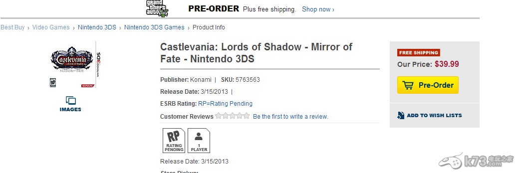 日前,百思买(bestbuy)的一条网站预购引起了众多玩家的关注。其网站上上架了3ds动作游戏《恶魔城 命运之镜》的游戏,游戏发售日期一栏上标明了本作将会于2013年3月15日发售,这与官方之前声称的游戏将会延期至明年初发售一致。