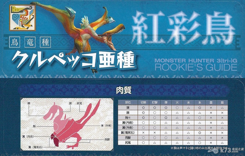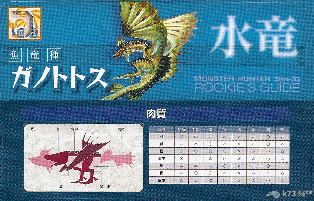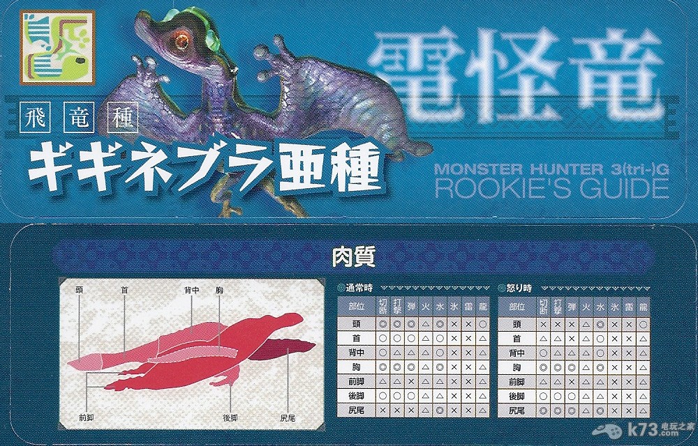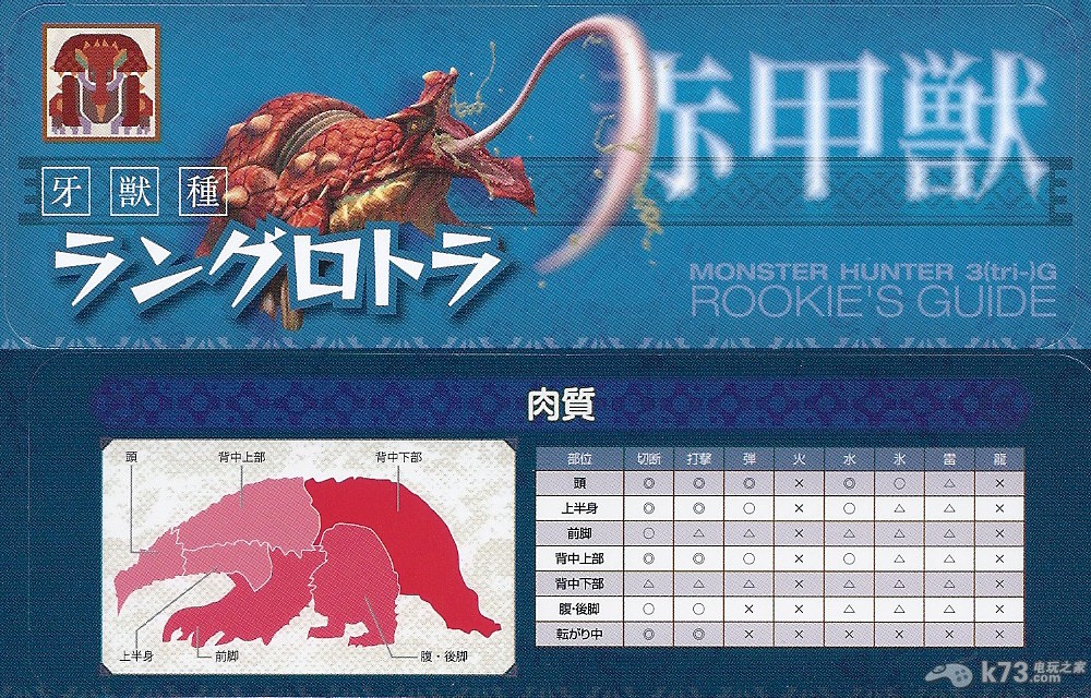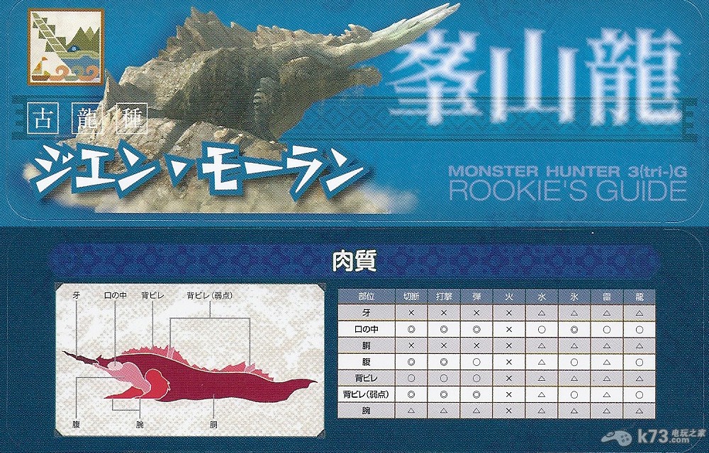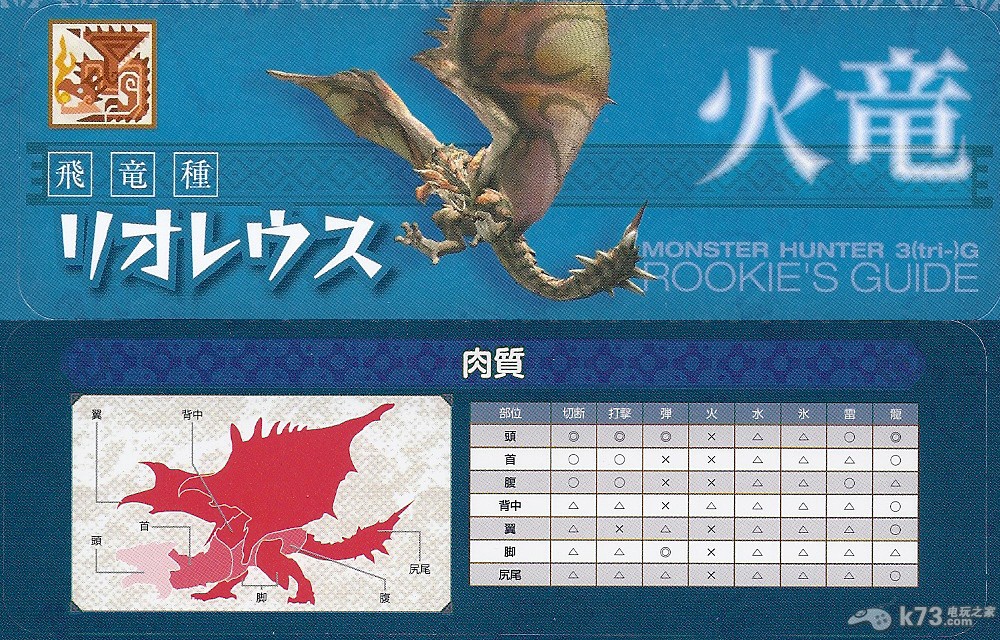 《怪物猎人3G》作为怪物猎人系列目前可玩到的最新的怪物猎人作品,游戏在加入全新的G级任务以外仍然保留了系列以往的系统和要素。游戏中boss级的怪物均存在肉质这一专用名词,有些地方的肉多,有些地方的肉少,肉多的地方不会弹刀且对武器的磨损少,而肉少的