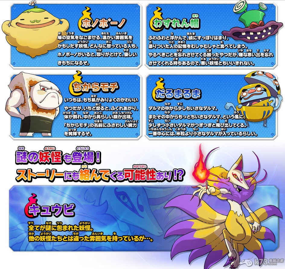 四个新登场的妖怪,它们均有其不同的特色。另外,官方还公布了一个帅气的谜之妖怪,它拥有其它妖怪的不具有的雾气。