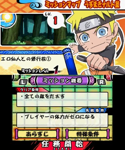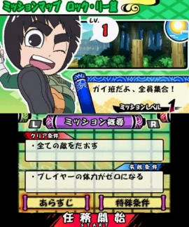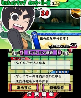 在本作中有各式各式的任务,漩涡鸣人篇跟李洛克篇加起来总共有 100 种以上。不是只有以到达终点为目标的关卡任务跟打倒 BOSS 的任务而已,而是每个任务都有设定各种过关条件。