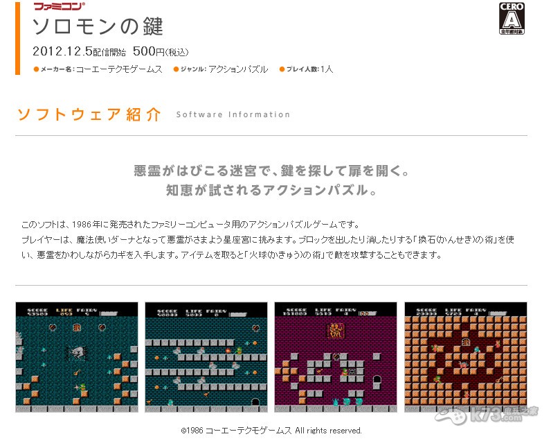 根据任天堂官方网站的最新消息,任天堂官方将会在12月5日对3ds eshop VC频道进行升级,此次升级将会增加一个全新的游戏配信,它就是FC的经典游戏《所罗门的钥匙》。