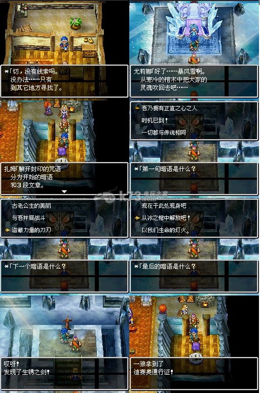 进山洞之后与人女士谈话然后回村找刚才的老头,再回去祠堂找刚才那位女士,发生剧情。返回村庄,村民们都恢复原状了。到教堂找扎姆交谈得知传说之剑的情报,来到北方山顶的山洞按照 132 顺序的暗号成功把大门打开。一直来到底层发生剧情后取得剑。
