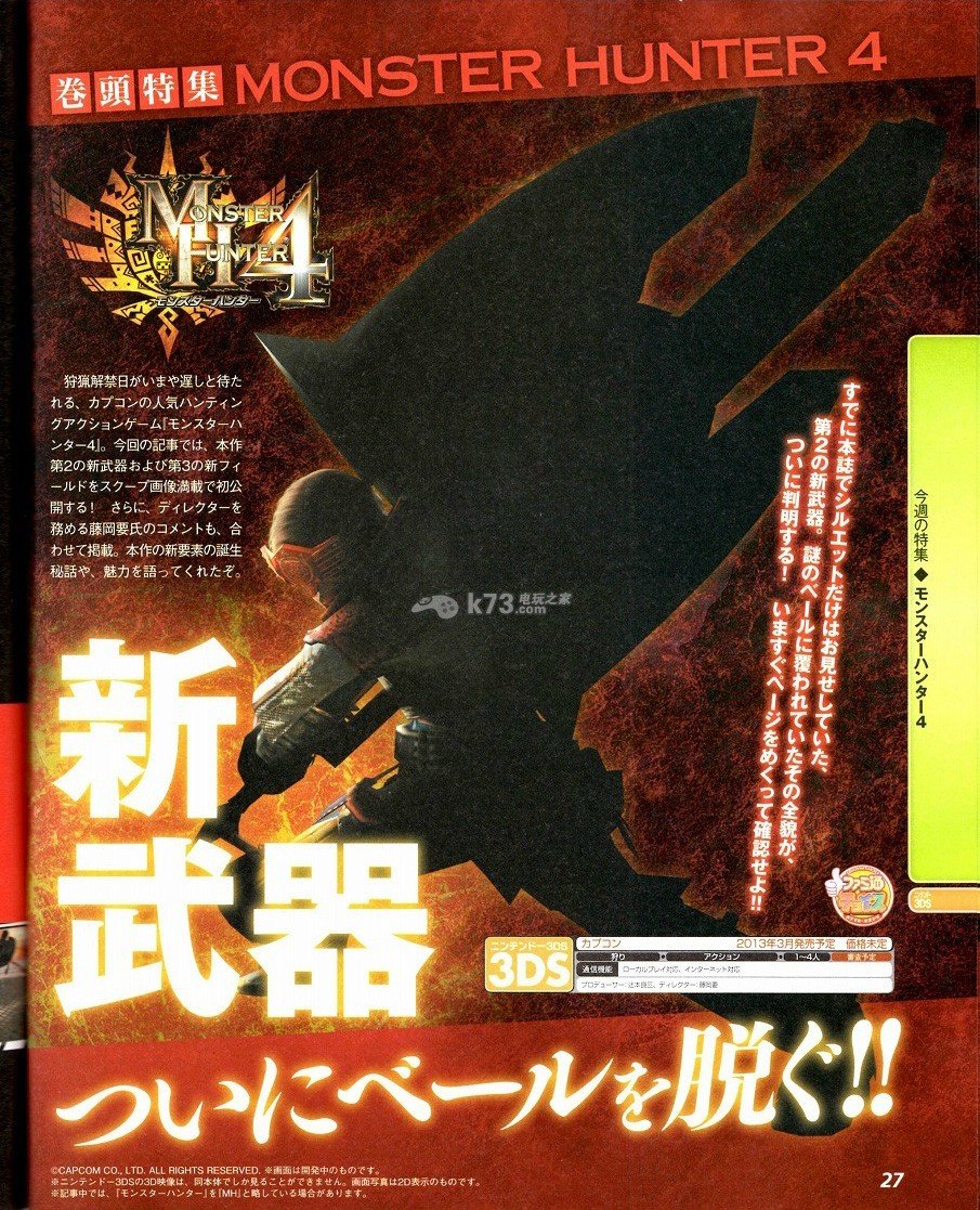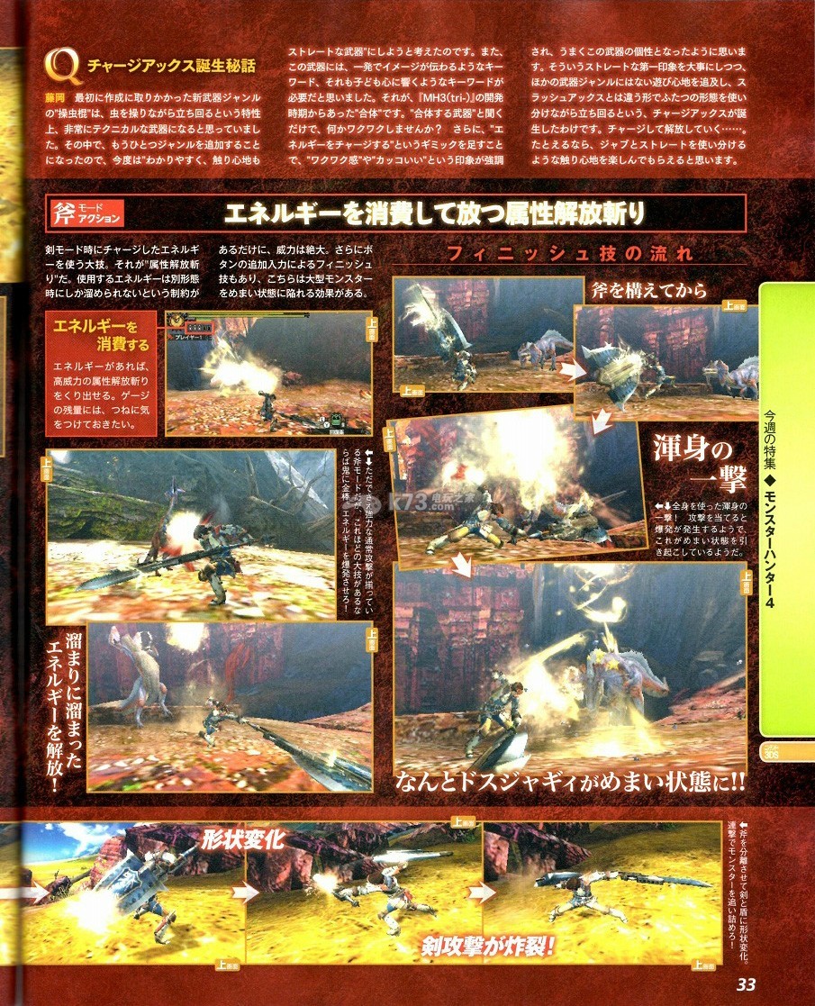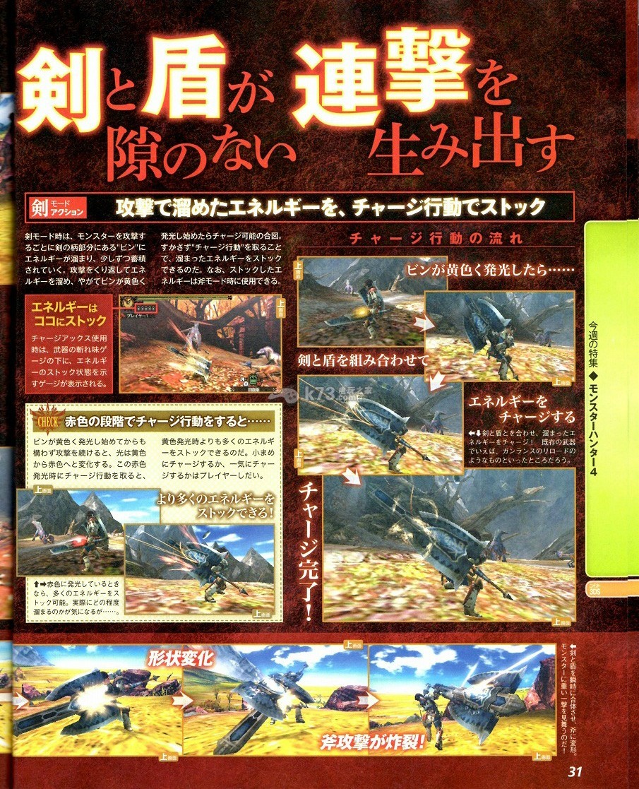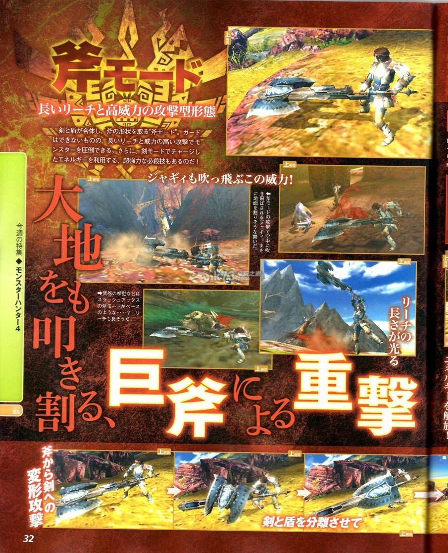 本期的fami通杂志图上公布了大量《怪物猎人4》的全新情报,新的武器蓄力斧以及全新的冒险区域地图原生林终于首次向世人亮相,让我们来看看新武器的特点和全新的冒险区域吧!