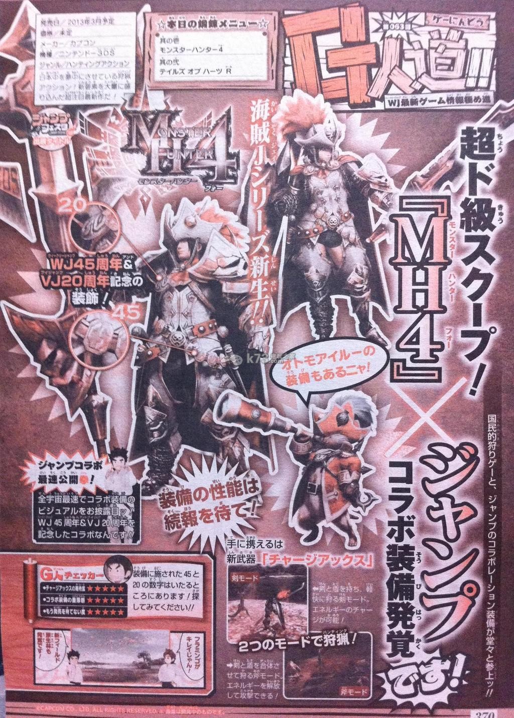 日前,少年Vjump杂志公开了其新一期的杂志图情报,前段时间得到确认的Vjump为纪念公司成立而推出的《怪物猎人4》纪念套装海贼套装的清晰杂志图得到了放出,以下是杂志图详情。