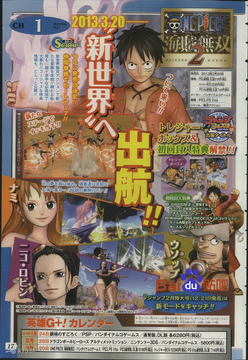 根据本周少年Vjump周刊的最新杂志图消息,预定登录PS3和PSV双平台的海贼无双新作《海贼无双2》的具体发售日期得到了确认,本作将会于2013年3月20日再度热血归来。