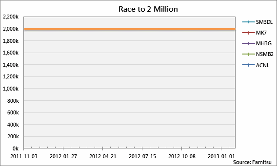 目前,3ds平台上销量过百万的游戏有《超级马里奥3D大陆/乐园》、《马里奥赛车7》、《怪物猎人3G》以及《新超级马里奥兄弟 2》等多款游戏,让我们来看看这几款游戏的销售轨迹图的对比吧!