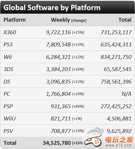 2013年首周游戏主机销量3DS排首位,达一百万以上,其次为X360第二,PS3第三位,游戏软件方面X360销量排首位,PS3第二位,下面是本周游戏主机销量及游戏软件销量排名具体数据。