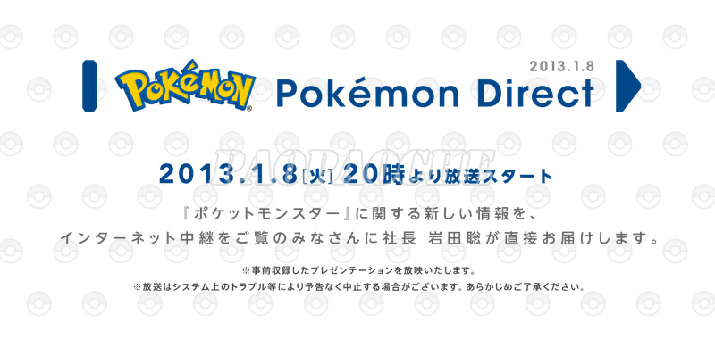 任天堂于1月8日20:00在任天堂官方网站举办线上发表会“Pokémon Direct”,由任天堂社长岩田聪亲自发表来自《口袋妖怪》的最新消息,下面是这次发表会的视频。