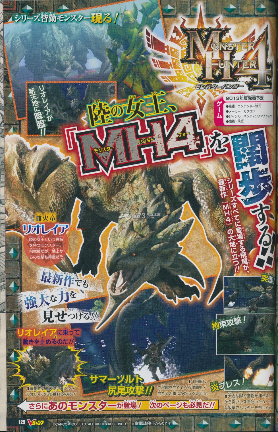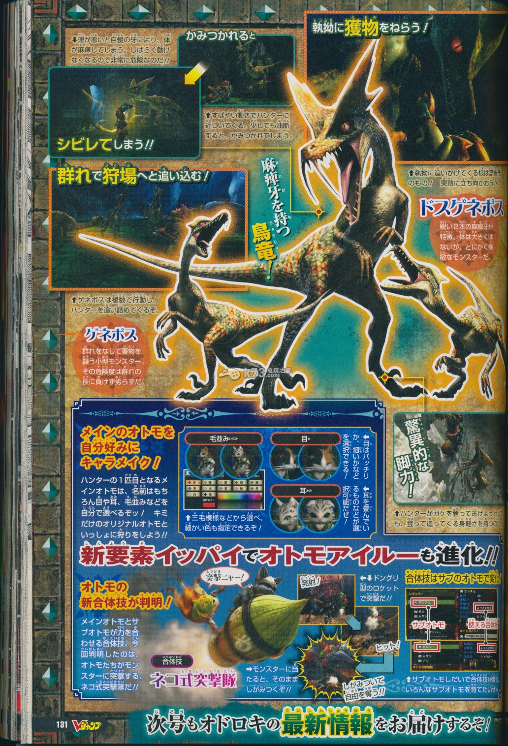 本周的少年Vjump杂志图上公开了3ds《怪物猎人4》的全新杂志图情报,近日得到确认的几个经典怪物黄速龙、桃毛兽、雌火龙的攻击方式的介绍得到了判明,以下是杂志图详情。