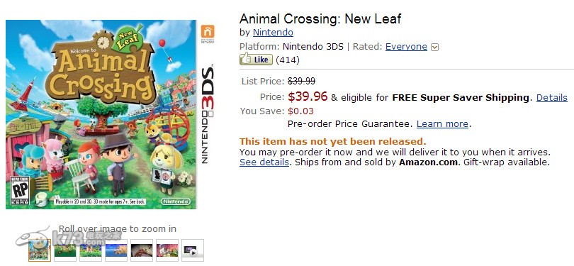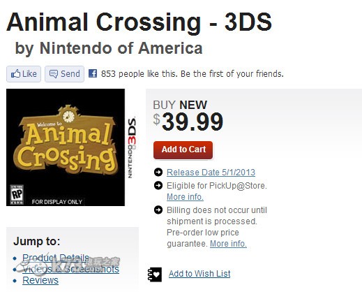 来自国外知名游戏销售网站gamestop的消息,其公开了将于今年春季登录北美地区的3ds游戏《来吧!动物之森》的预订页面,同时公开游戏预订页面的还有亚马逊网站。