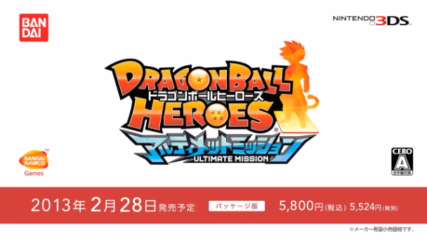 NBGI宣布表示,将预定于2013年2月28日在3DS主机上推出一款人气动漫《七龙珠》系列最新改编新作游戏《七龙珠英雄:终极使命》(Dragon Ball Heroes Ultimate Mission),定价5,800日圆。