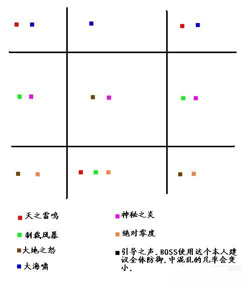 要点:BOSS有2个状态.2个状态物理攻击都不高.全靠魔法攻击.会5个属性的攻击(风.雷.火.水.冰.物理).第1状态(血量大约1万2)技能有顺序.可以无伤打到第二状态.第二状态是无顺序的随机释放第一状态下的全部技能(就这点难).站错队形可能就全秒了!第二状态血量大约2万.多多准备【药草精华50以上】和【女神之泪30以上】!剩下的就靠磨合运气了!