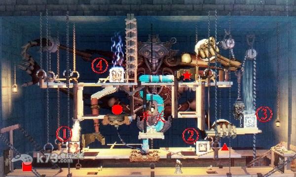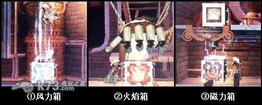 (1)①为火焰箱,②与④为配套的磁力箱,③为风力箱,中央为提线偶人的开关。第一步,操作开关将②挪开,将①拖动至▲位置,火焰会将巨手融化,使③掉落至地面;