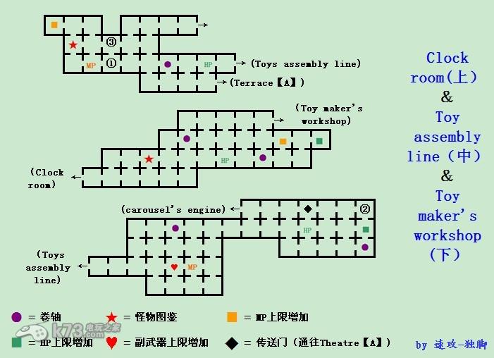 此处的三个区域拥有不少联动的关系,因此放在这里一并写出。通过此部分的顺序为:在①处可以学会狼形态,今后可以通过所有的鬼头门,此时钟塔上方因为电流的关系无法到达,先不去管它。地图中间的Toys assembly line区域机关众多,需要一定的技巧和观察力,不要一味鲁莽的向前冲;在最下方的Toy maker's workshop最右上方②处取到沙漏副武器,功能是让时间及敌兵动作变慢。回到Clock room,利用沙漏来到③处,取得电磁轨道滑索的能力,此时已经可以去到之前所有区域的任何地方,好好的探索一番吧。