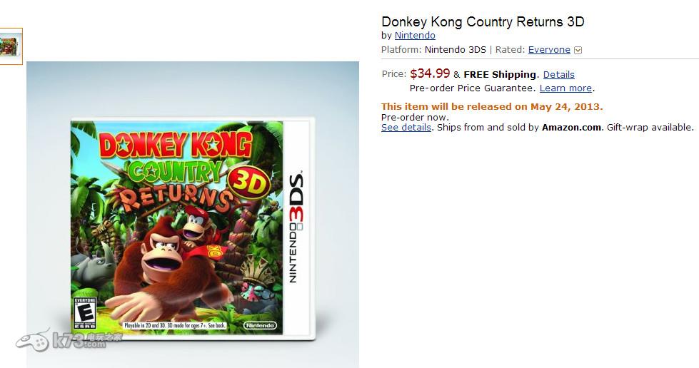 日前,北美亚马逊方面公开了任天堂将于3ds平台发售的动作游戏《大金刚回归3D》的游戏预订页面,同时还放出了游戏的实体版封面包装图,各位封面控们看过来哟!