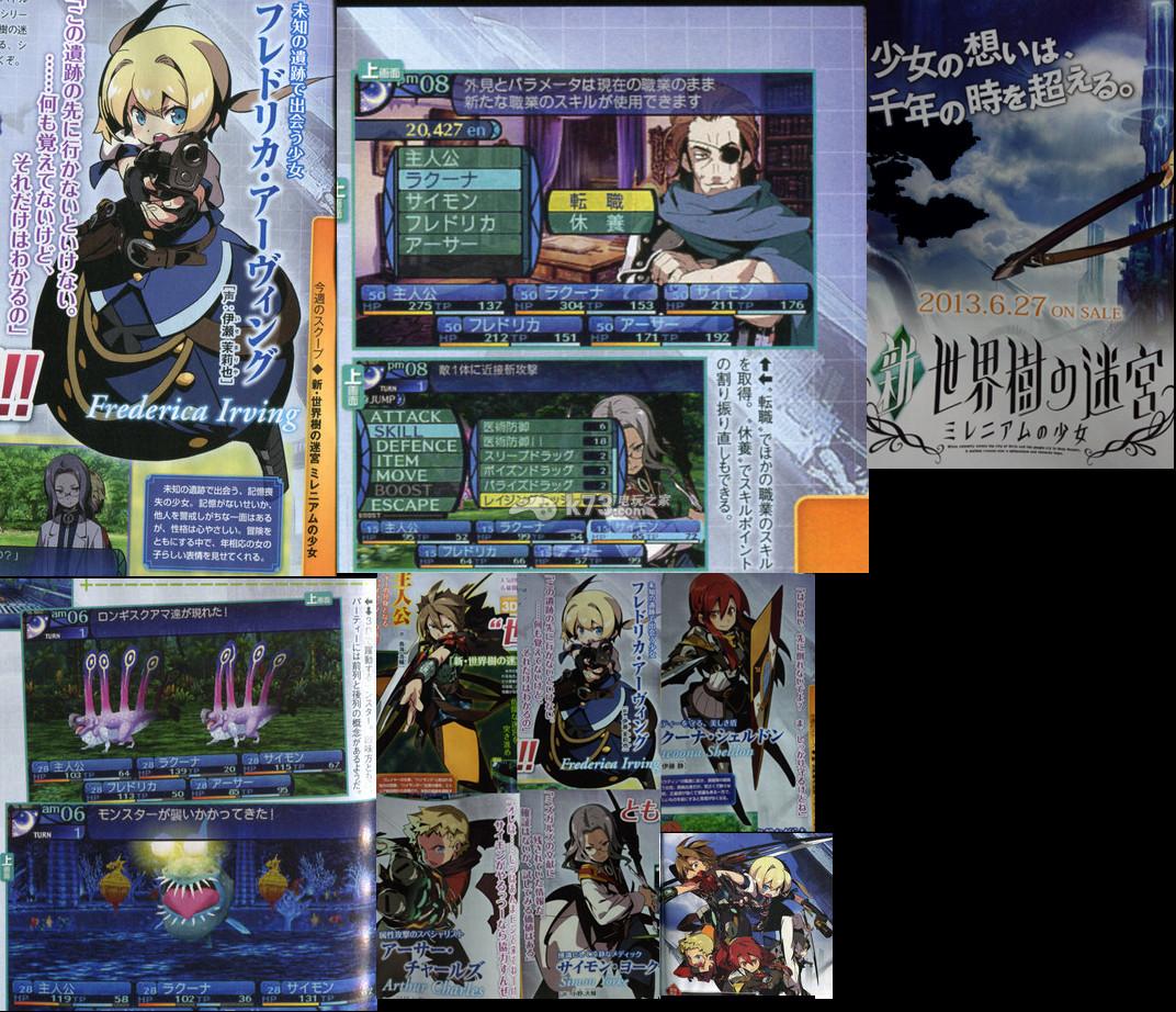 本周的fami通杂志图上公开了3ds《新世界树迷宫 千年的少女》这款新作的情报并放出了大量的游戏细节情报,包括了游戏的制作团队、游戏故事背景、主人公一行人的介绍、职业及转职、职业技能、【エトリアの街】的选项菜单等情报。