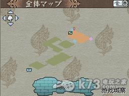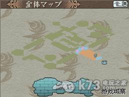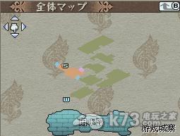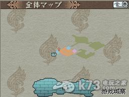 场景6:这里可以记录一下,然后使用滑索降落到地图中间的一个细长条的地带。注意看地图找对时机按B键落下即可。这里虽然有上下两个出口可以走,不过我们现在只要直接向下就能来到ラーケイクス所示的地点。