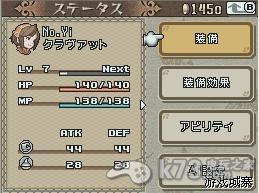 而当我们进入到ステータス菜单后便能方便的看到当前控制的角色信息。(如下图)这里能直观清楚的看到角色的ID、等级、升级所需经验值、HP、MP、物理以 及魔法的攻击防御。而在这其中还能选择“装备”选项查看并替换当前装备。“装备效果”选项查看当前装备上附带的特殊效果。“アビリテイ”选项可以查看当前 角色习得的技能。而最后的“AI设定”则是对同伴的行动做出预先设定。