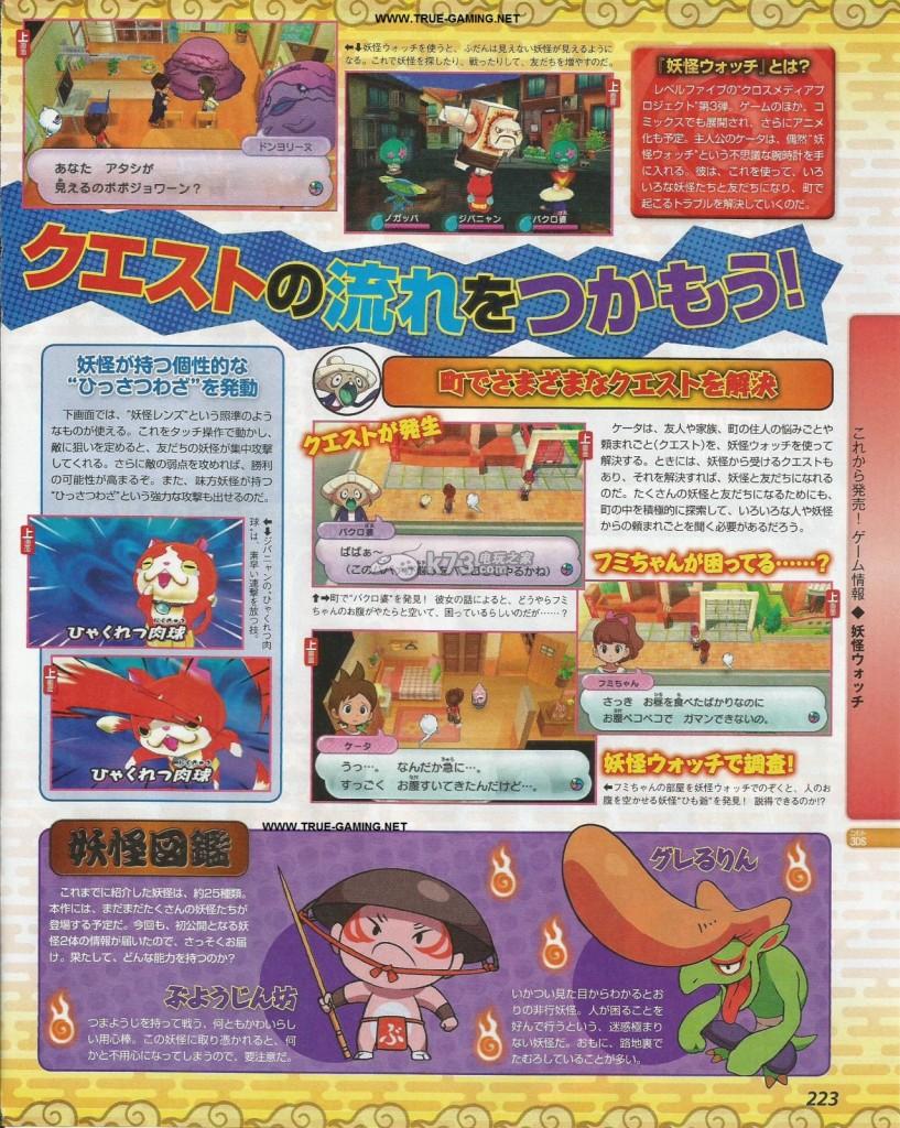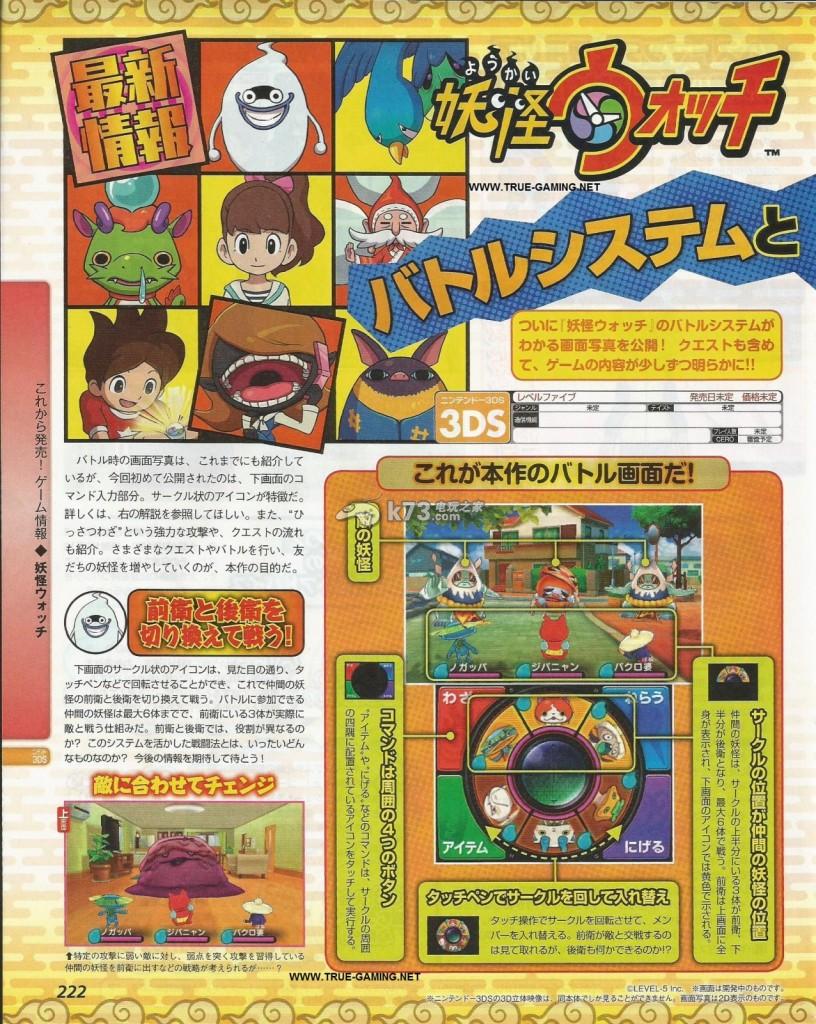 日前,网络上流出了两张3ds平台发售的角色扮演游戏《妖怪手表》的杂志图,这两张杂志图分别揭示了本作的战斗系统的菜单介绍以及游戏的任务流程及妖怪图鉴的内容。