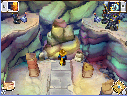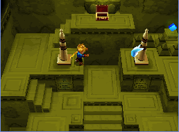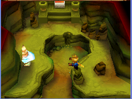 击碎之前看到的那个岩石,可以从花朵图案升降梯(奇怪的称呼)所在房间的右下出口回到那里,乘升降梯回底层。对着底层大石像前发亮的图案使用火球,向下的阶梯开启。下台阶,踩下开关进入恭帕洞窟。