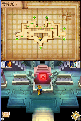 从台阶下面回到刚才那个场景,有一扇门和一个藤梯,藤梯可以回到遗迹的正门,让你拿到之前看到的那个宝箱,里面是精神力水晶。从门口进入,这里是遗迹的4楼。沿路向里,最深处的房间里通过多次抓握来到中间的平台上,对红色宝珠使用火球,启动机关。现在有着红色图案的石块可以用火球击碎了。