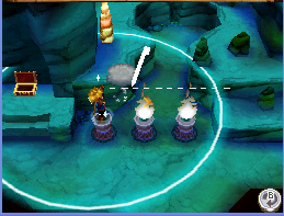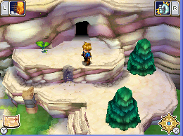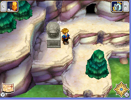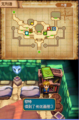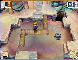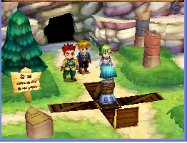 向左沿路走去,在第一个石柱的位置推下石柱后记得把石柱往右移动一格。沿路上行,在断梯前有个人,从他旁边的斜坡滑下(如果刚才不移动石柱的话就落不到下面),得到宝箱里的皮靴,然后对小树苗用生长回到上层。沿路走去,对螺旋桨花使用旋风,从上方洞口进入下一场景。
