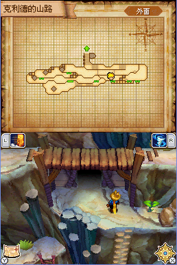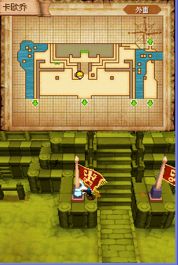 卡欧乔,城门口右侧的宝箱里是一件旗袍。左上角的民居里得到一位大娘托你交给她在萨纳国的孙女的礼物。从上方右侧一条狭长的小路走到下个场景,跳上王城,中间对旗杆使用一次抓握绕到左边,可以得到一只地精灵吉斯,至于城内另外那只位置很明显的火精灵目前得不到,因为有个小孩子挡路了……