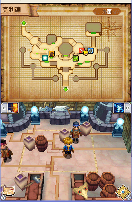 先回收场景内的宝箱吧。在宿屋左侧本是水路的地方有一扇门,进去获得宝箱里的生命面包。右下角的楼梯下楼尽头宝箱里是水之粉末。从左下角的台阶下楼,与之对称的位置的宝箱里是299金币。如果从在左下的台阶往左走的话,来到一个房间,把里面的石柱推到坑里。暂时先不要管它了。