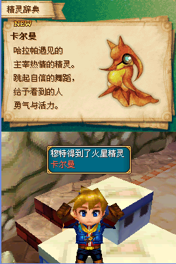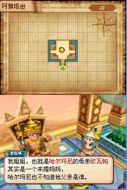 发生剧情。剧情中,古代宝玉“沙之王子”与哈尔玛尼对话,剧情后进入房间右上方的门。调查石板,得知吹奏大树之笛可以召唤沙之王子的灵魂。吹奏吧。与BOSS沙漠王子战斗。胜利后得到沙之王子,特里装备后习得精神力蒸干——话说前作的烘烤是水系术士的精神力啊现在变成火系了?回到外面,对炼金术水井中央的水盆使用蒸干,触发剧情。
