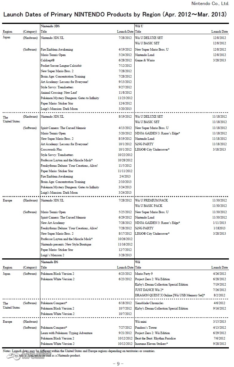 2012年4月至2013年3月的3ds WiiU游戏阵容发售表格: