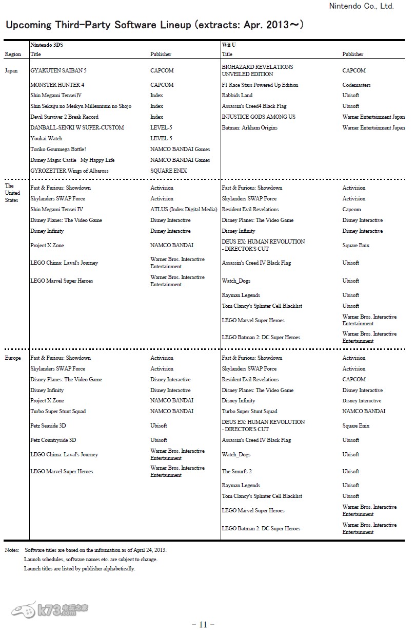 2013年4月之后3ds WiiU游戏新作发售日期表格: