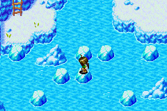 接着到右面不远处的南大陆东部小岛。跳过移动冰块后上去将木条推下去铺路。