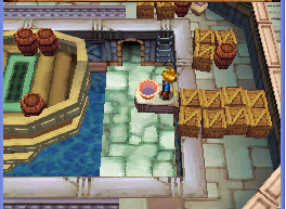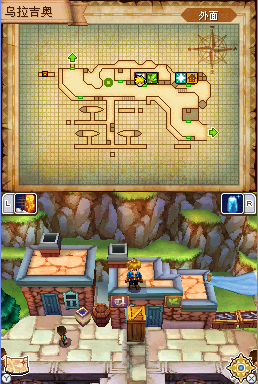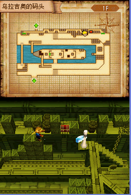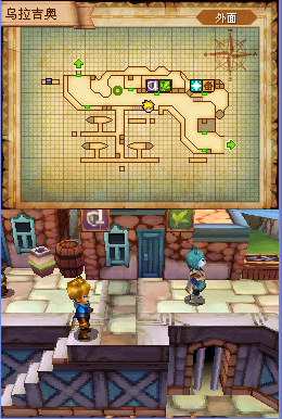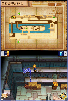 到乌拉吉奥,从村北偏西的树爬上去,绕到道具屋楼上,把木箱推下去,然后一直推到水里。利用这个木箱做落脚点一路走到右下角,移开木箱走进码头排水沟。看小地图发现排水沟有左右两个方向可走,左边尽头是一个宝箱,里面是个防御坚果。右边沿路走到尽头,是码头内部,穆特等人见到了帕亚亚姆的船。