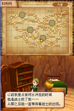 村里的道具店复活,可以买到梦之叶了。梦之叶的使用方法,到村子的宿屋住宿,店主会问你是否使用梦之叶,使用的话就可以进入梦之世界,回到梦之叶迷宫。记得买一片梦之叶,波尔达村用得着。宿屋顶楼的衣柜里可以得到一件黑衣。