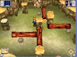 然后再次把水蒸干,这次让横置的那根木桩滚到最下面被石头卡住,再把右边竖着的木桩推过来,形成一个横置的T,然后复原水位,向下进入下个场景。沿路到达一个有两根木桩两滩水,一只火精灵的场景。