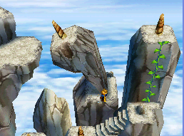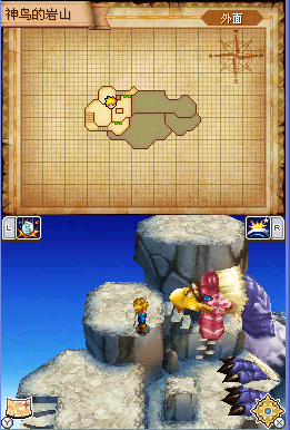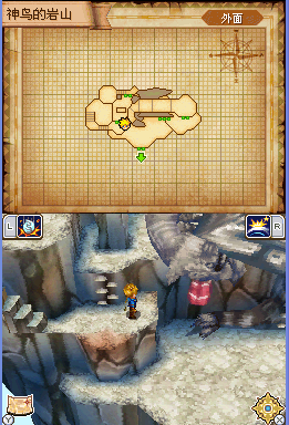 进入神鸟岩山,一开始左侧的树爬上去往左走可以得到宝箱里的精神饼干。先在右边的石梯下和树旁各造一个冰柱。上树,爬到上面去把石柱移开,这样中间的梯子就可以爬了,爬上去,把石柱继续向左推,接到左边的石梯下,然后爬上石梯向左,得到宝箱里的光环手套。往右爬,上去敲碎石块,进入下个场景。地上满是神鸟的脚印(爪印),移动石柱得到右边宝箱里的妖精刺剑,用另一种方式移动石柱可以继续攀登。