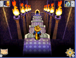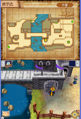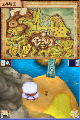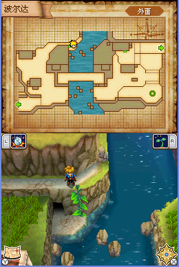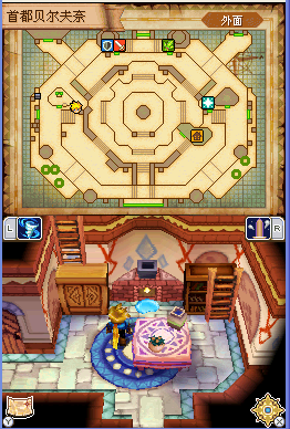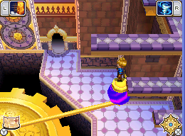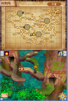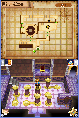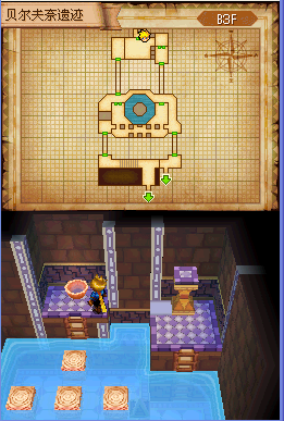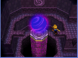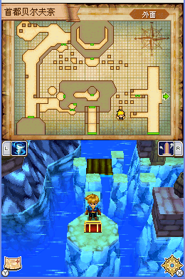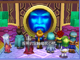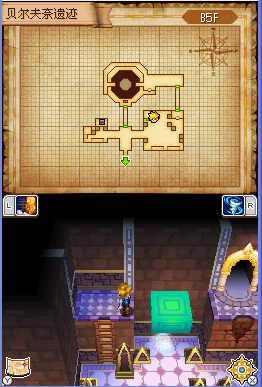 回到大齿轮的房间,跳上运动的齿轮来到场景右边,往上面的门进去,跳上齿轮往里深入,会从大齿轮房间的右下出来,推下石柱,获得宝箱里的混合药水。接着上台阶进门。把浮游石先往右再往左推,获得宝箱里的高密度波罗石。接着再将浮游石按右、下、左、上、右、上的顺序推到两个高台中间,用旋风顶起浮游石,跳过去。
