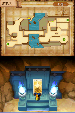 从史黛拉出现的门进入,发现史黛拉来时的原路已经无法返回,一路向下走,从新产生的台阶下去。到了地下大门处发生剧情,刘项和宝山再次出现,他们终于从那条路跟过来了。剧情后,把两侧表示太阳和月亮的宝珠推到三角形的两个顶点上,穆特一行人再站到下方表示物质的点上,遗迹大门开启。