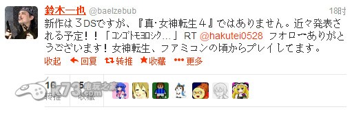 铃木一也推文翻译:新作将登陆3ds平台,但不是《真女神转生4》。游戏将于近期发表!