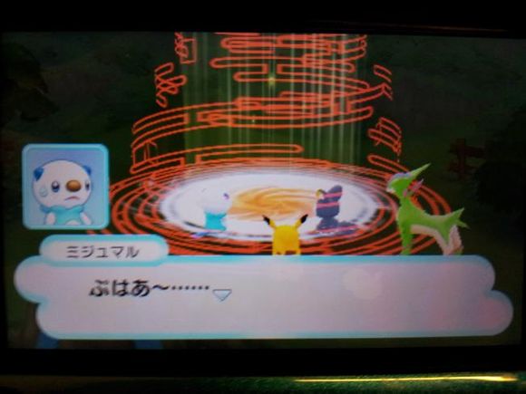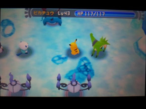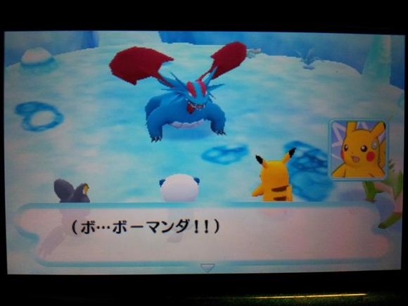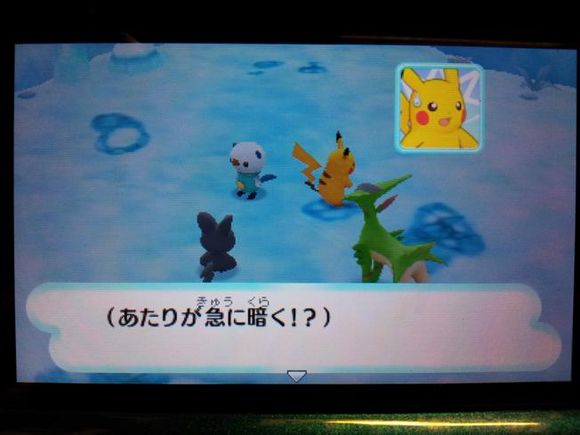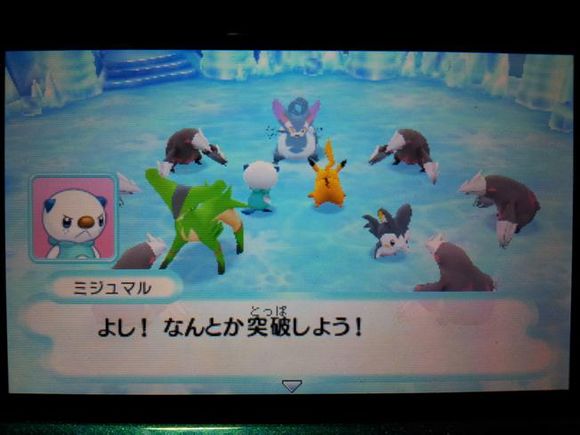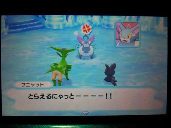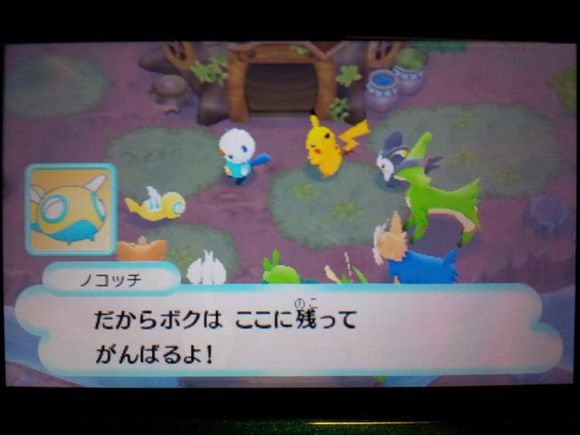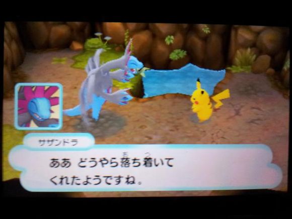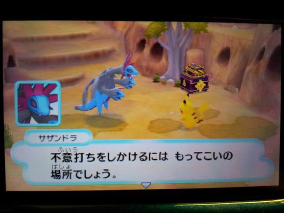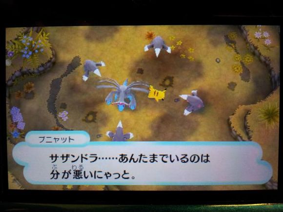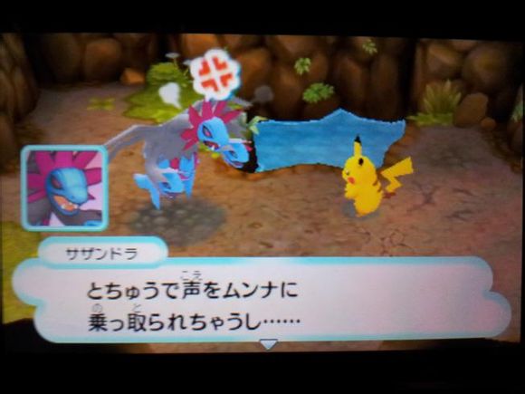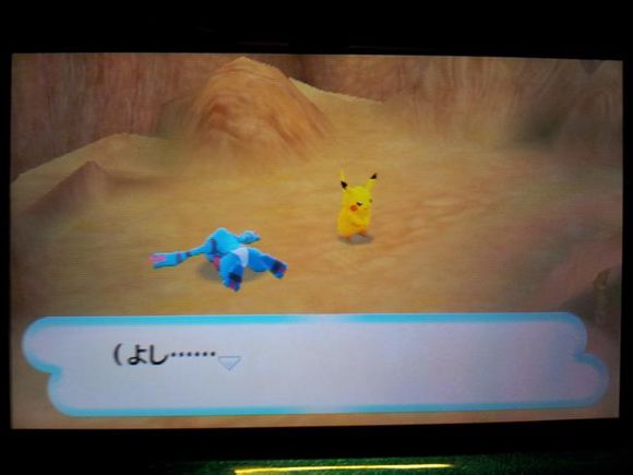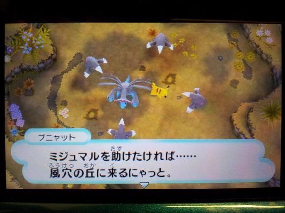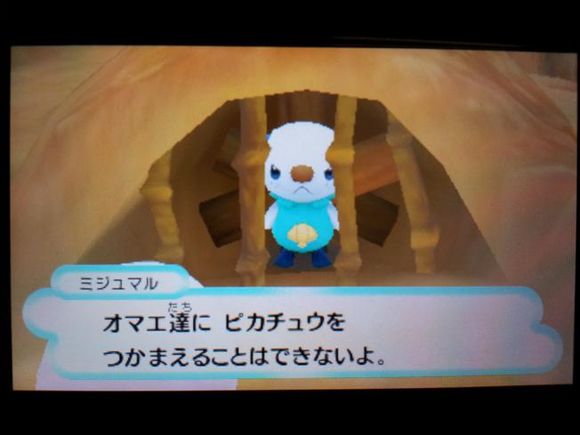 从背后打倒毒骷蛙后皮卡丘来到关着水水獭的牢笼前却发现里面只有留言结晶,水水獭实际被关在【风穴の丘】的洞里