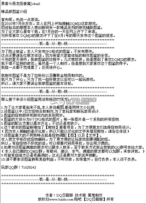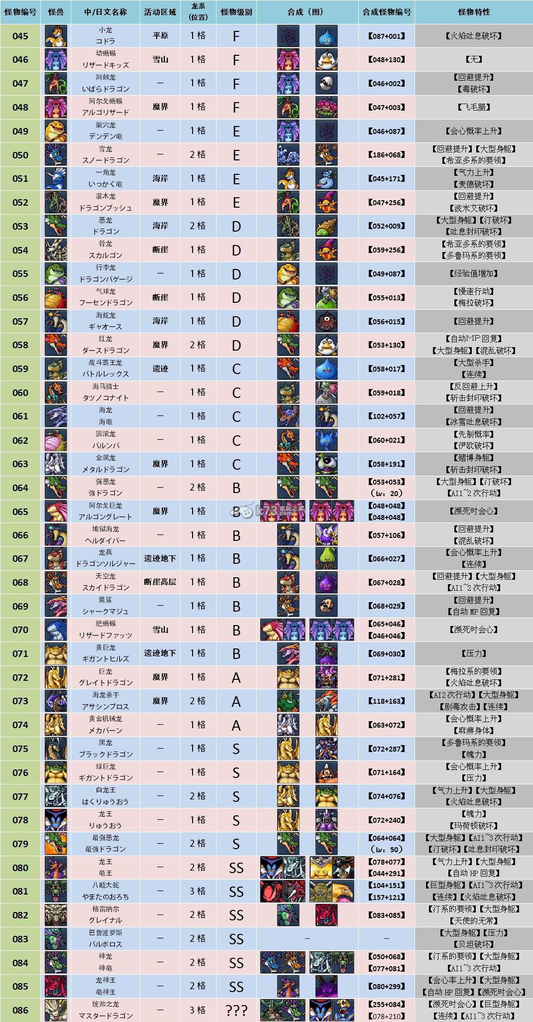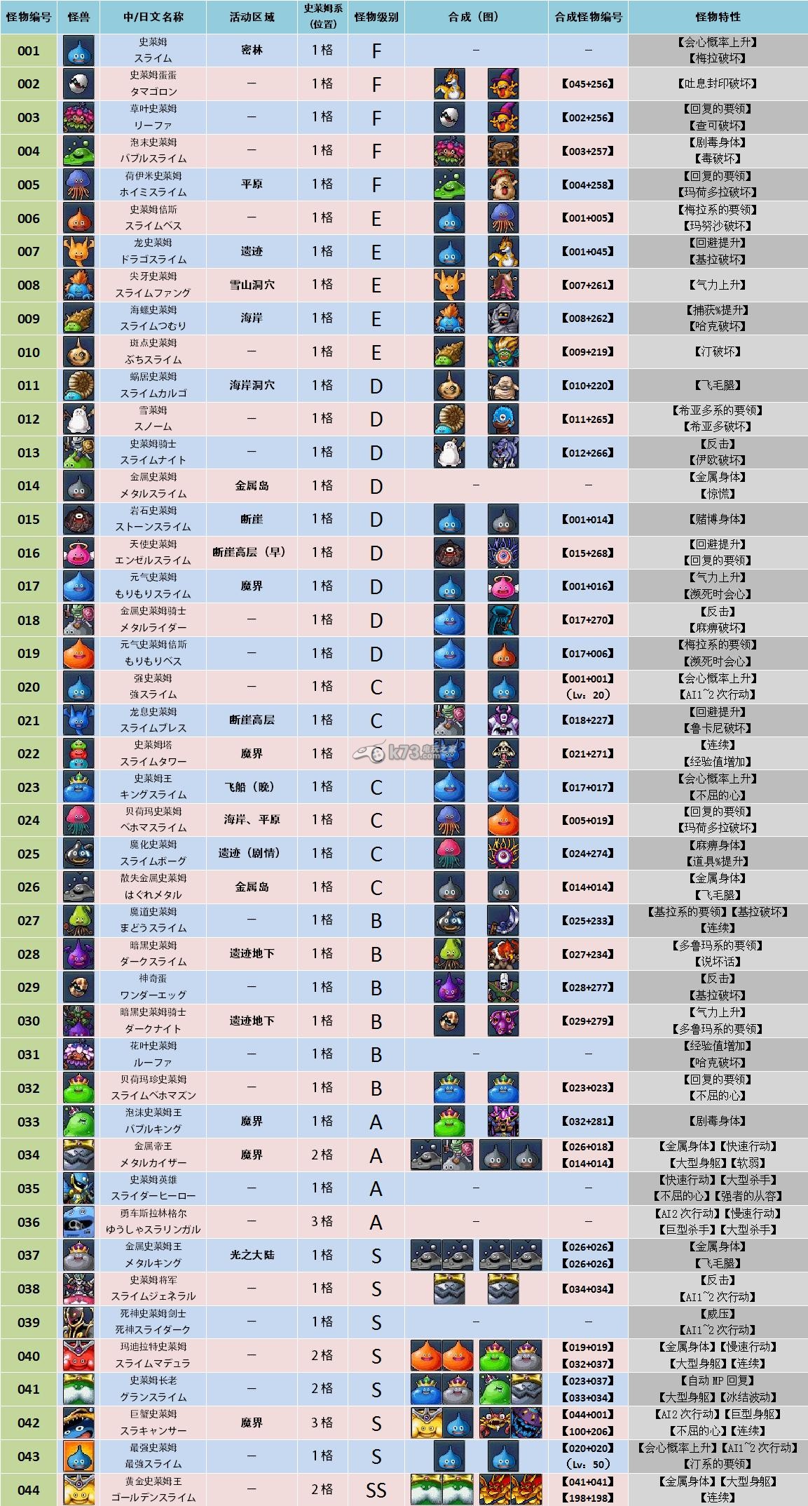 作为登陆nds平台的第二款怪兽篇作品,《勇者斗恶龙怪兽篇joker2》改进了前作的诸多不足的部分,新加入了更多的怪兽和巨大boss等的设定,游戏也更加的耐玩。系列最引人入胜的系统就是怪兽的交配系统了,为了方便大家进行游戏的怪物捕捉、怪物特性的查询以及怪物出现地点、交配公式等,下面就给大家带来本作的怪物图鉴!