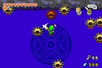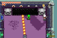 第三形态的魔人古夫,在他的手从地面伸出后,用弹跳仗攻击他的手,使其绷直,变小进入其中,找到图34中林克攻击的小眼睛猛砍。另一只手也是一样,只是要用燃灯,如果时间过长,只要重新来过就行了。两只手都被消灭后,回来变大,分身用剑反弹古夫的攻击,反复几次即可(图35)。