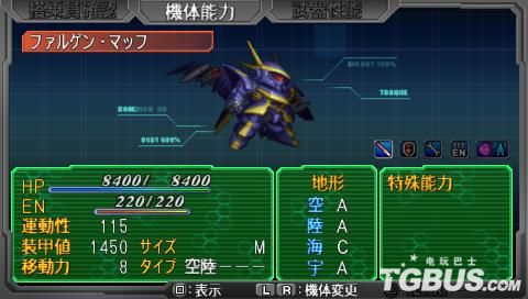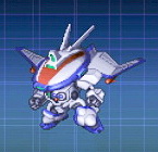 让人非常惊讶的机体,初始一看以为是笨拙的MA,但是竟然有120的运动性加1500的装甲,射程有5,大招满改之后威力6700,1-3格可P,可惜出场非常非常的晚,如果有好的驾驶员可以考虑换乘一下这架,不过30多话才出场的它正常都应该被格纳