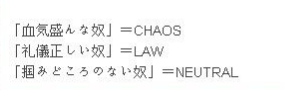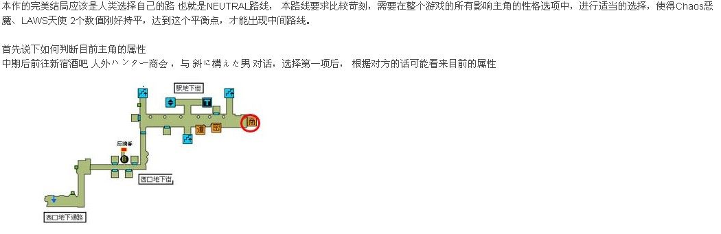 新宿酒场里和最左边的男人对话,可以根据他得回答来判断主角目前的属性."血气。。。**"=CHAOS,"礼仪。。。**"=LAW,“掴。。。**”=NEUTRAL。