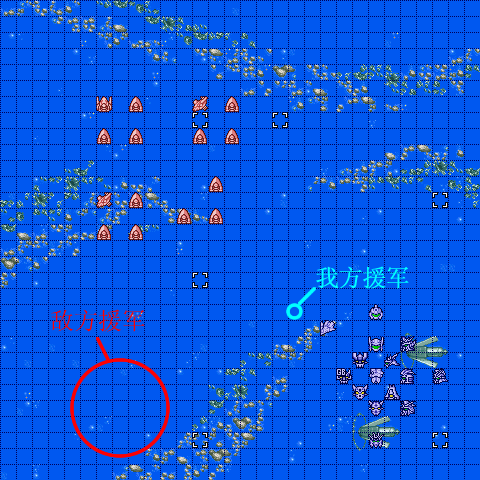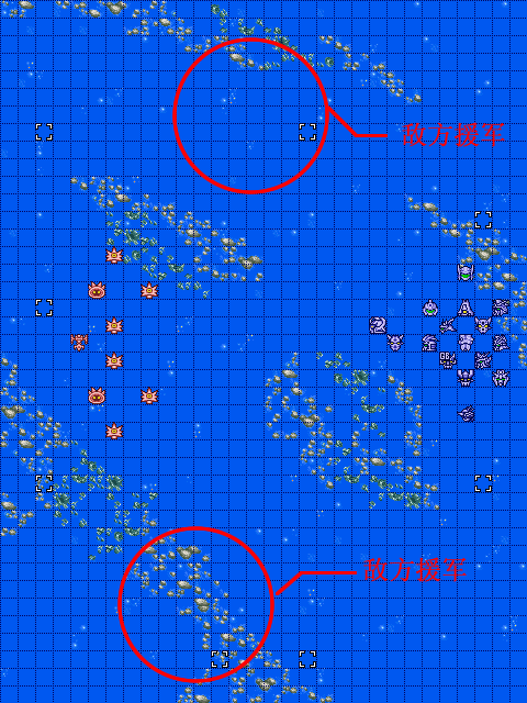 攻略要点: 本话一开始只有真盖塔和ビッグ·オー两部机体,而敌人都是从海里过来的,建议变成真盖塔3号从海里迎击敌人,而ビッグ·オー则尽量使用带有移动力减低效果的武器进行攻击。第二回合本方援军在地图左上方出现。在初期敌人全灭以后,敌援军在右下角登场,而本方明神タケル带着ゴットマース作为援军参战。ゴットマース的能力很强,但是注意保护,因为一旦他死了就会GAME OVER。BOSS属于母舰类型,除了血多一些以外毫无是处。这一话中敌方的ベムボーグ·グルゾン一开始是不能被击破的。等全部敌人消灭完以后发生剧情,接下来就可以打掉它过版。 |