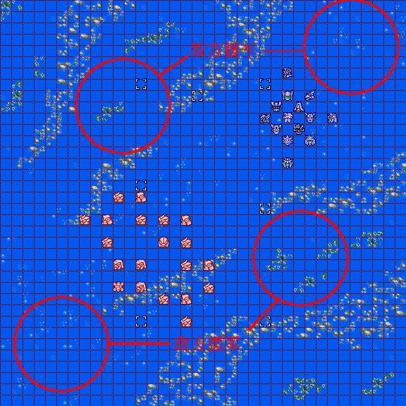 攻略要点: 这话的胜利条件是阻止敌军进入指定地点,因此在战斗一开始最后就将战线扩展,另外不能将其中任意母舰击落,否则也会被判定失败。在将其中ドゥカー舰的HP消减到20%以下的时候,敌方援军GR-2ガーランド会在敌母舰周围登场。这种机体回避率极高,建议使用必中在反击回合里面将其全部歼灭。在将初期的ドゥカー和ピピニーデン两艘母舰HP消减到20%以下的时候,クロノクル就会带领援军从地图左侧出场。在将其HP消减到20%以下之后,敌人就会撤退。注意本章敌人的攻击力很高,多使用集中和必闪是很有必要的。 |