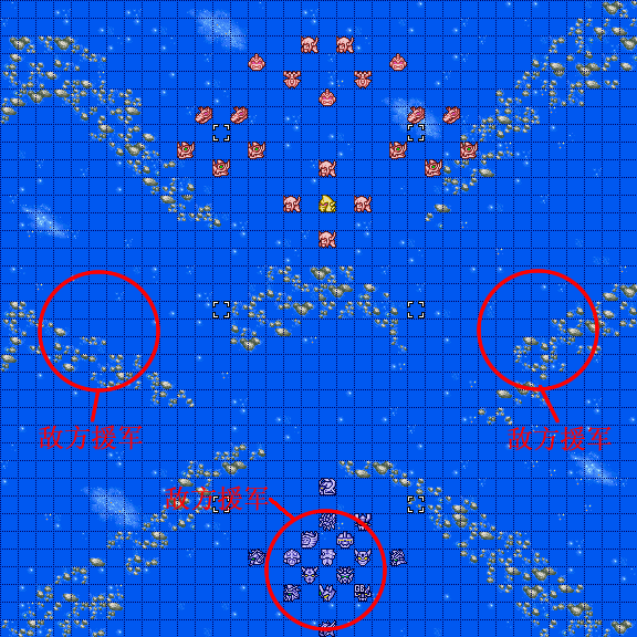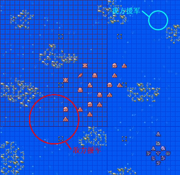 攻略要点: 本话初期敌人分在左右两侧,自然我军也要分成左右两批去打,建议抢占卫星作有利地形,很容易解决的。在初期敌人剩下5机的时候,ロゼ带着援军从上方出现。如果先前满足说得マーグ的条件的话,这里用タケル对ロゼ时会出现说得指令。说得后击破,过版。这关主要就是仪仗卫星为根据地,没有太大的难度。 |