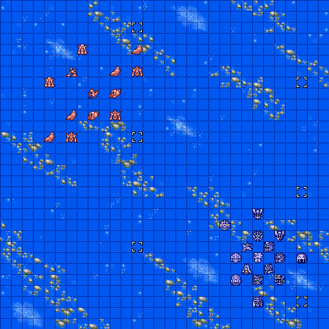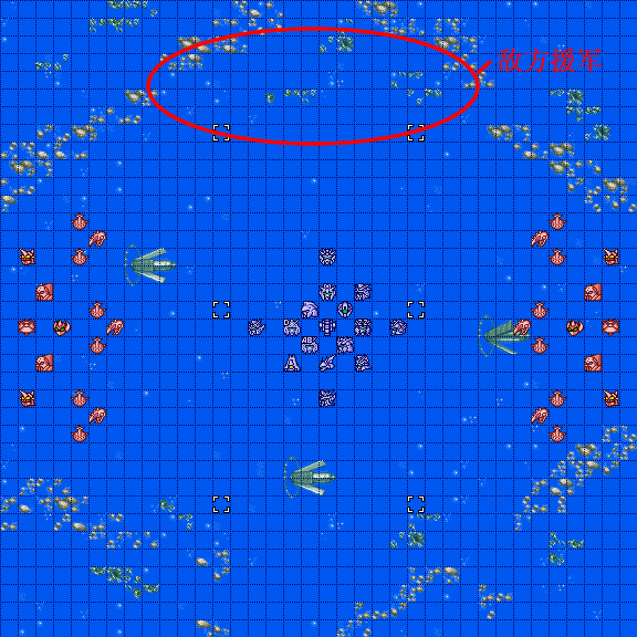攻略要点: 后半战最初我军在右上侧,而敌军在地图中央附近,加速移动的话很快就会遭遇。敌人初期的战斗力就比较高,如果不想让剑人孤军奋战的话最好让其回撤一下,或者也可以使用铁壁消耗敌人。这次战斗只需要留意敌方母舰的一种特殊武器,命中的话会有3回合不能移动。 |