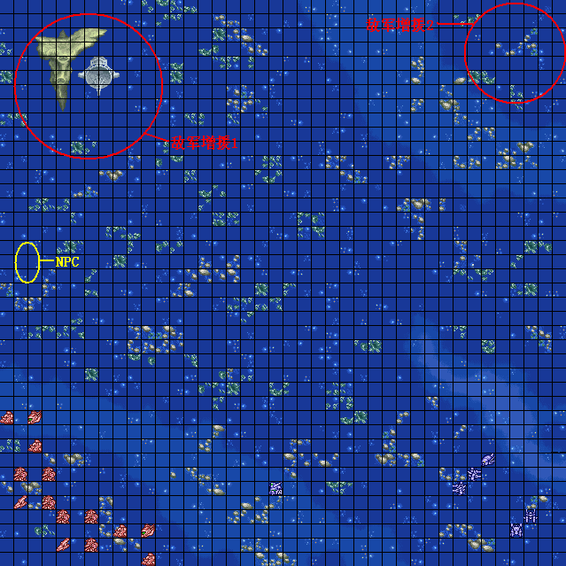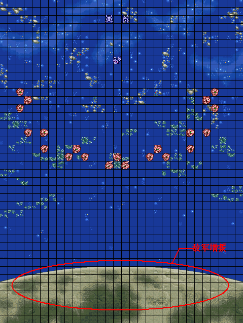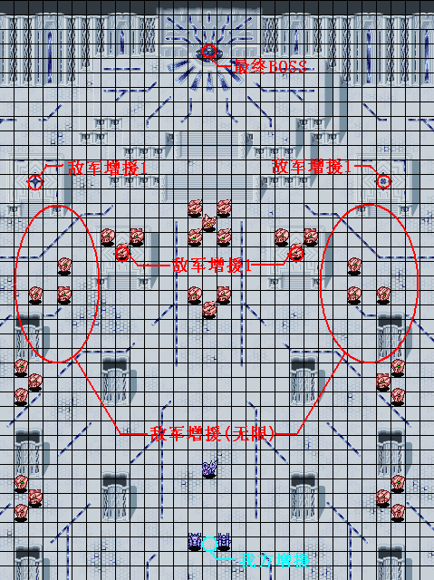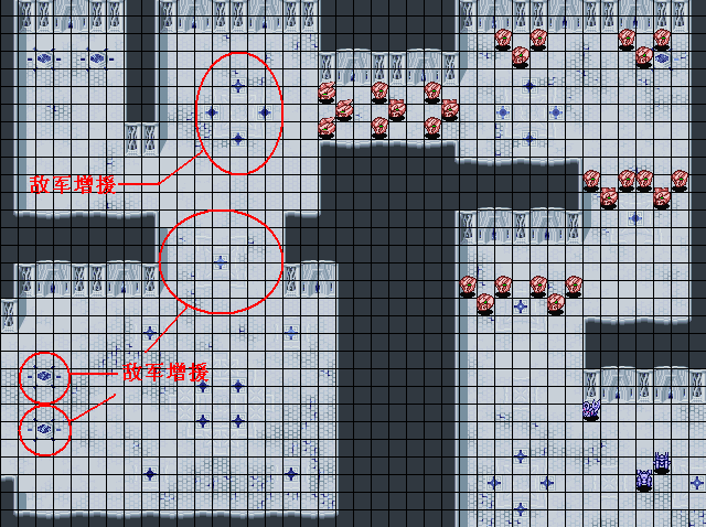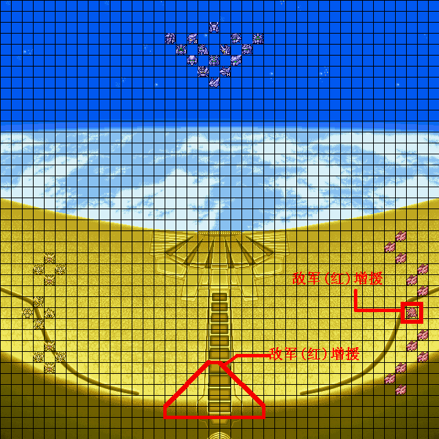 | 战术指南: 初期那些敌人只会拦路,不会动的。敌人的增援在数量剩余9机后出现,这里有个窍门,可以让主角等有跳跃能力的人先提升气力,然后穿越防御的敌人先冲到左下的能量恢复点处,这样10回合内保证可以结束战斗。 |