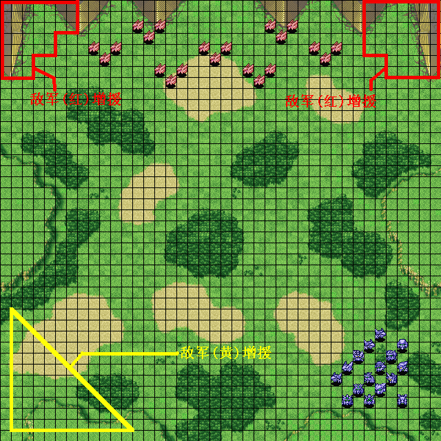 | 战术指南: 开始的敌人不是很难对付,只是要注意减少消耗。第二批敌人出现在下方,不要着急,先把杂碎角色干掉后再去动グ=ランドン。グ=ランドン除了会跳跃武器威力大外没别的厉害,计算好他的路程,在他跳过来后争取一回合消灭他,否则挨他一下MAP可不是好玩的。 |